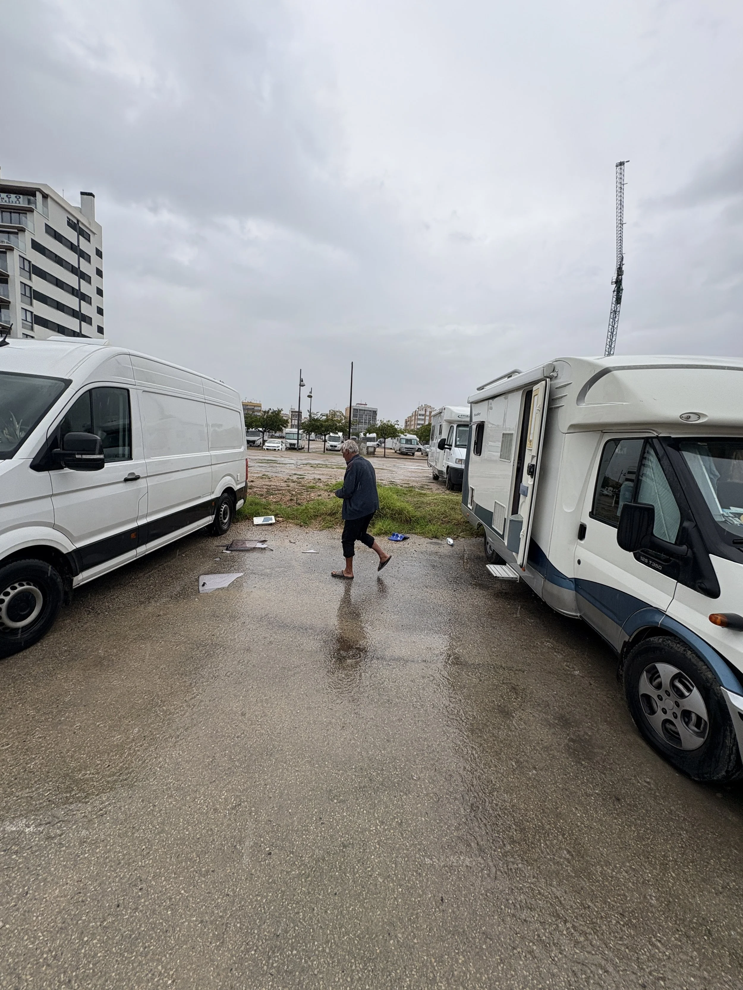 Te midden van dat creatieve ritme kwam plots de kracht van de natuur heel dichtbij. 24u regende het, met heftig onweer en bliksem. In de namiddag hoorde ik een knal en dacht ik dat er iets op mijn Van terechtgekomen was. Ik keek buiten en zag brokstukken langs de Van liggen. Ik dacht ooooo nee en ging naar buiten in de fele regen met mijn blote voeten in de plassen. Ik zag geen schade aan de Van en begreep er niets van. Plots kwamen mijn buren uit hun camper, helemaal in shock. Toen zag ik het, de brokstukken waren hun raampjes. De knal die ik hoorde en voelde was de trilling van een blikseminslag in hun camper. Hun camper total-los, zij zelf gelukkig niets. Ik kwam er met de schrik vanaf. Het was een moment dat me deed beseffen hoe kwetsbaar we zijn, en hoe weinig we eigenlijk te zeggen hebben wanneer de natuur spreekt. Het raakte me, maar tegelijk bracht het ook een gevoel van nederigheid en respect: de natuur als krachtig wezen dat herinnert aan onze plaats in het geheel.